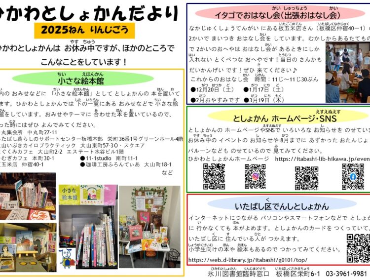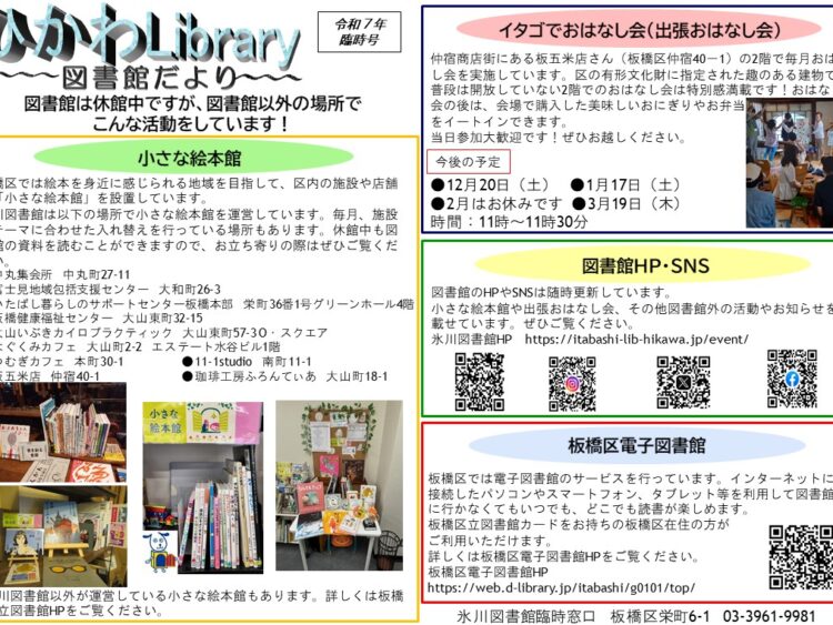12月の「イタゴでおはなし会」のお知らせです。 日時 12月20日(土)11:00~11:30 場所 板五米店二階お座敷(板橋区仲宿40-1) 料金 無料 氷川図書館は現在休館中ですが、地域と連携して図書館外で実施してい…