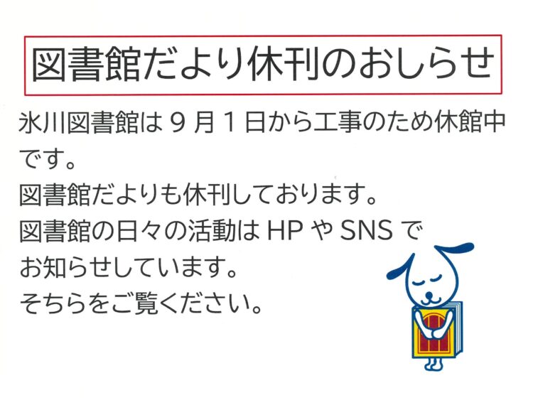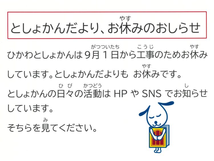 【氷川図書館長期休館のお知らせ】9月1日から3月2日まで