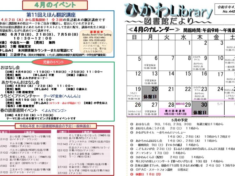 4月2日(木)より、氷川図書館 第11回えほん翻訳講座の募集を開始します。 全3回の英語絵本の翻訳講座です。 参加者の方には事前に課題絵本の指定ページをご自身で翻訳し、提出していただきます。当日は提出課題をまとめたものを…