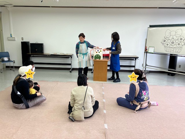 おはなし会では手遊びの後に、大型絵本や布絵本の読み聞かせ、紙芝居をしていただきました。