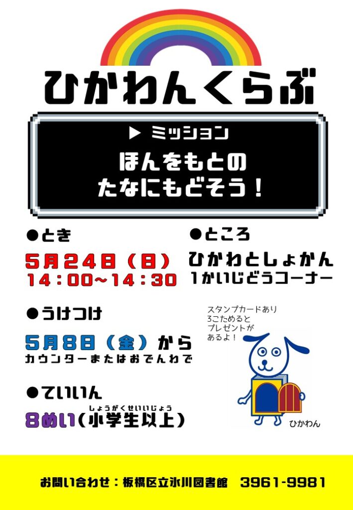 次回のひかわんくらぶ「ほんをもとのたなにもどそう!」は5月24日(日)の14時からです。