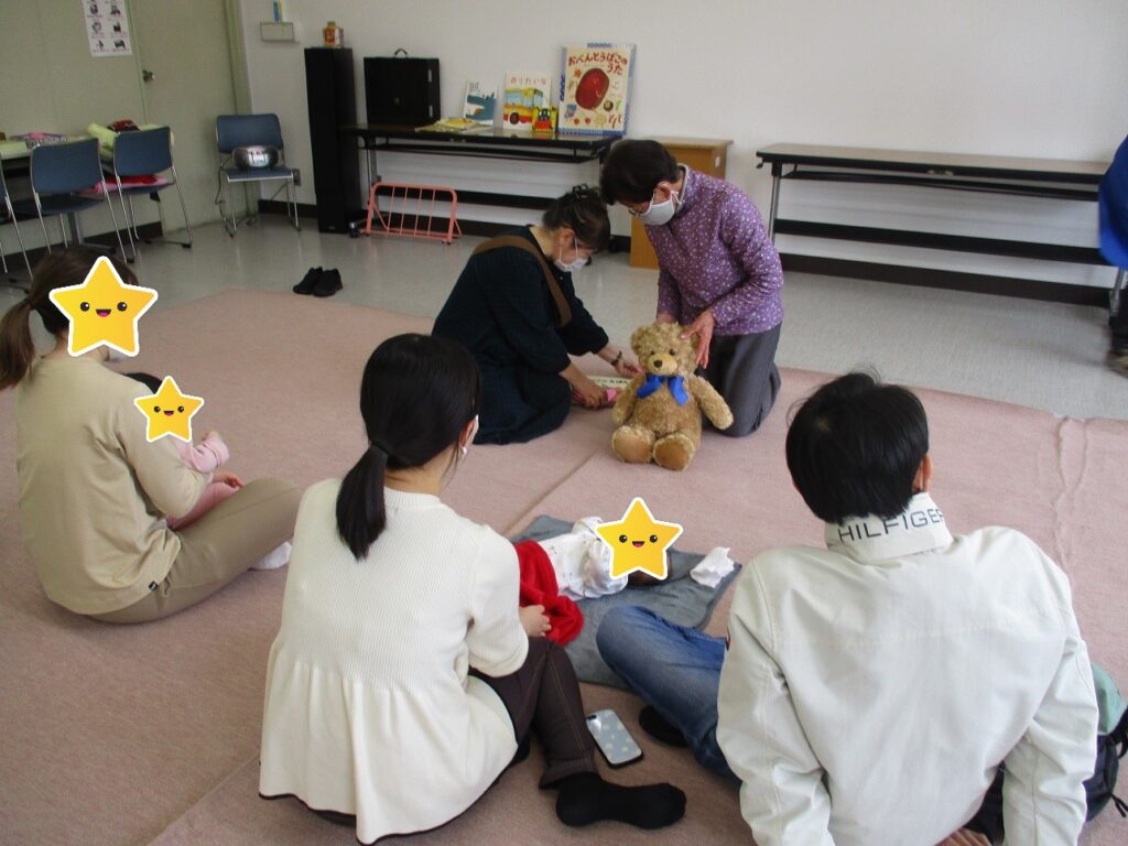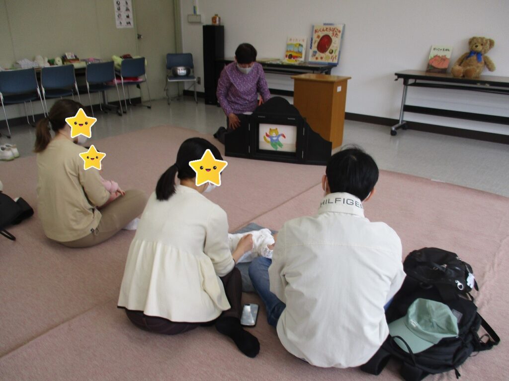 おはなし会では手遊びの後に、大型絵本や布絵本の読み聞かせ、紙芝居をしていただきました。
