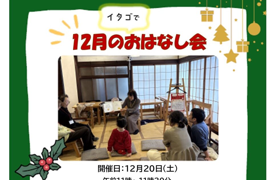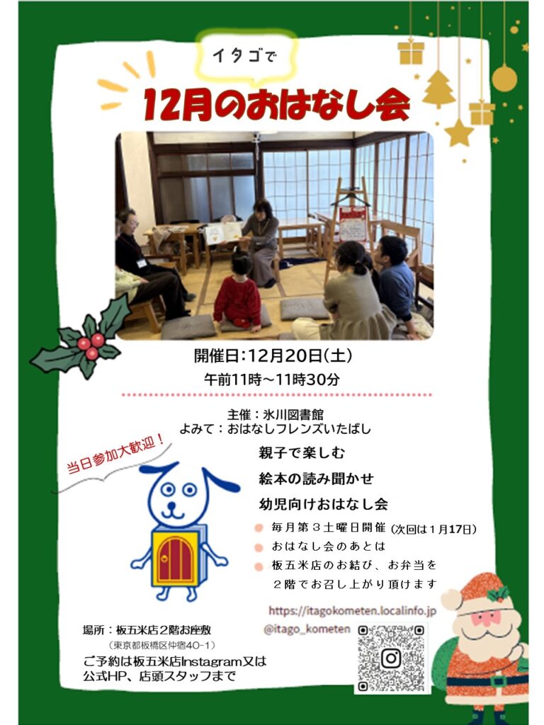 【予告】12月20日(土)イタゴでおはなし会 2025年11月24日 イベント告知 12月の「イタゴでおはなし会」のお知らせです。 日時 12月20日(土)11:00~11:30 場所 板五米店二階お座敷(板橋区仲宿40-1) 料金 無料 氷川図書館は現在休館中ですが、地域と連携して図書館外で実施しているイベントは開催しています。赤ちゃんおはなし会や土曜日のおはなし会にいらしていた皆さま、ぜひお越しください。お申し込みは板五米店さんのHPまたはInstagram、店頭にて受け付けています。 当日参加も大歓迎です! Share: Older Post 【トートバッグ当選者発表】☆デジタルスタンプラリー2025のお知らせ☆