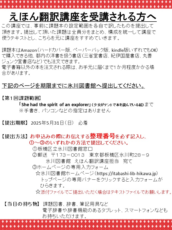 ②郵送 〒173-0013東京都板橋区氷川町28-9 氷川図書館 えほん翻訳講座担当 宛