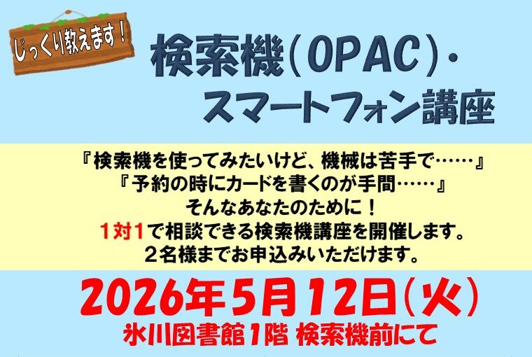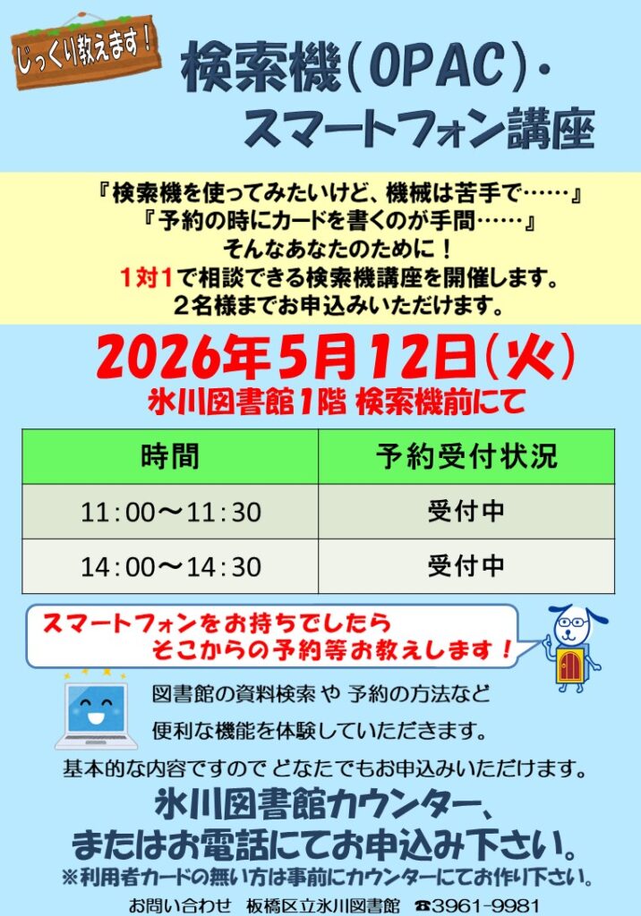【予告】OPAC・スマートフォン講座 2026年4月11日 イベント告知 1:1で相談できる検索機講座の開催です。図書館の資料検索や予約方法など便利な機能を体験していただけます。 【日時】2026年5月12日(火) 午前の部 11:00~11:30 受付中 午後の部 14:00~14:30 受付中 【場所】氷川図書館 2階 検索機前【定員】2名【申込方法】電話またはカウンターにて【お問い合わせ】板橋区立氷川図書館 03-3961-9981 皆様のお申込みをお待ちしております。 Share: Older Post ☆4月11日(土)のおはなし会を終えて☆