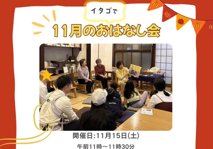 11月の「イタゴでおはなし会」のお知らせです。 日時 11月15…