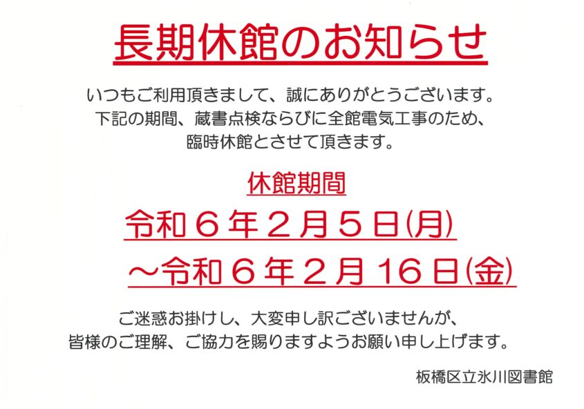 いつも氷川図書館をご利用いただきまして、誠にありがとうございます…