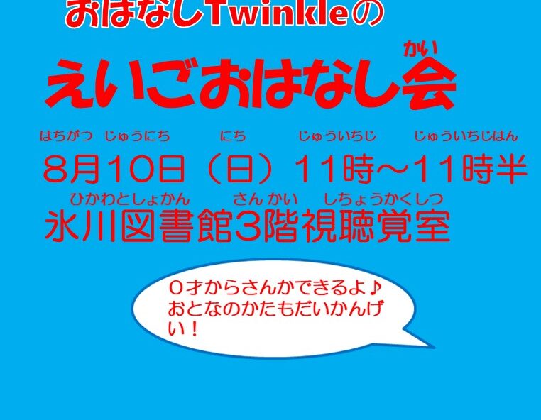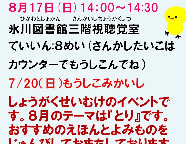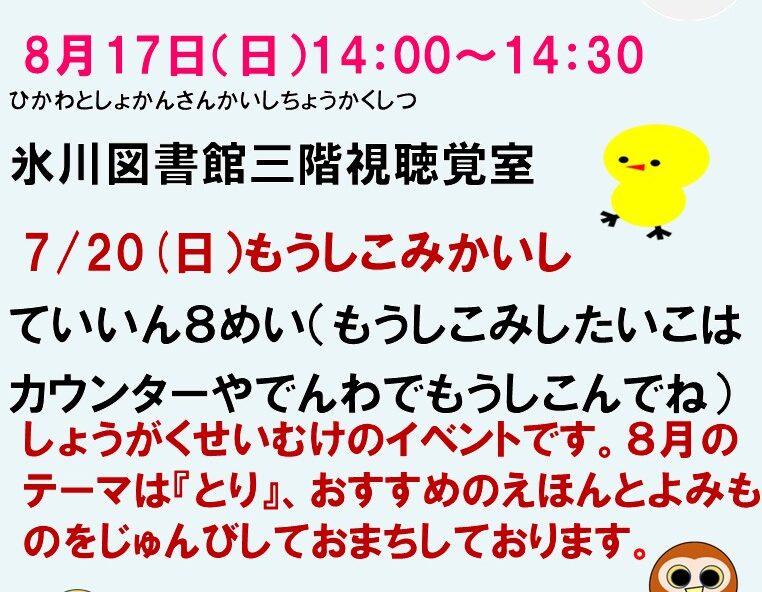 【日時】 8月30日(土)11:00から 【場所】 氷川図書館 …
