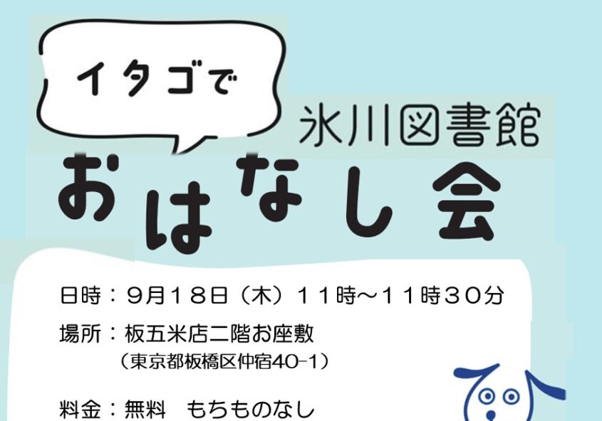 板五米店の2階で「イタゴでおはなし会」を開催します。 日時 9月…