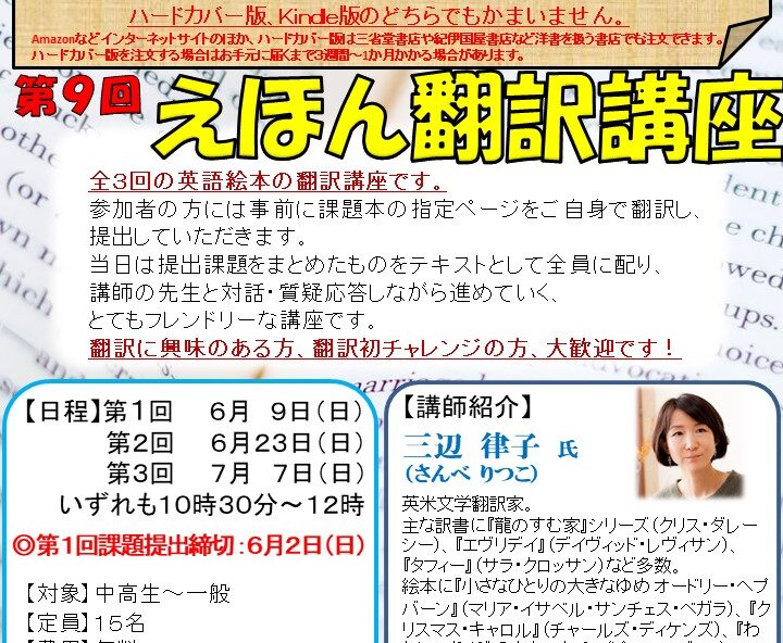 ※満員となりました。お申し込みありがとうございました。【予告】6月9日(日)、23日(日)、7月7日(日) 第9回えほん翻訳講座のお知らせ
