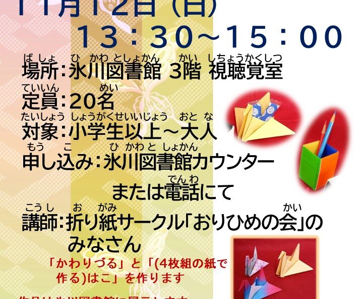折り紙教室を開催します。今回は小物入れにもなる「かわりづる」と4…