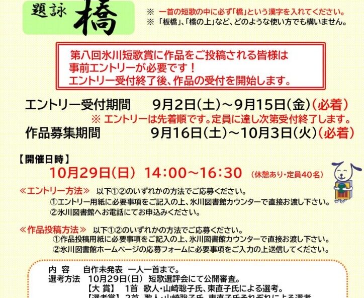 いよいよ9月2日(土)から、第八回氷川短歌賞選評会の事前エントリ…