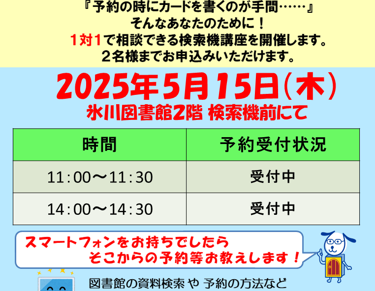 1:1で相談できる検索機講座の開催です。 図書館の資料検索や予約…