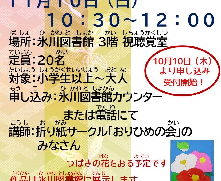 今年度後半の折り紙教室を開催します。10月10日から募集を開始し…